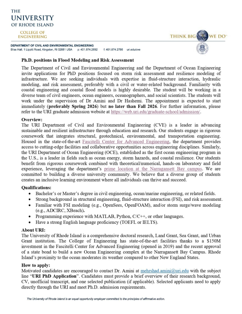 Motivated candidates are encouraged to contact Dr. Amini at mehrshad.amini@uri.edu with the subject line “URI PhD Application”. Candidates must provide a brief overview of their research background, CV, unofficial transcript, and one selected publication (if applicable). Selected applicants need to apply directly through the URI and meet Ph.D. admission requirements.