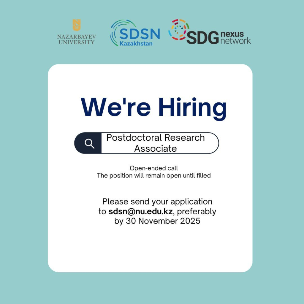 SDSN Kazakhstan is announcing a vacancy for a Postdoctoral Research Associate position, to work on the SDGnexus Network Project in collaboration with the Centre for International Development and Environmental Research (ZEU), Justus Liebig University Giessen (Germany). This project is part of a DAAD-funded initiative under the ‘Higher Education Excellence in Development Cooperation – Exceed’ program. The research focuses on advancing knowledge of the interlinkages between the Sustainable Development Goals (SDGs), with an emphasis on Water, Land Use, and cross-cutting themes such as climate change, biodiversity, governance, and gender.