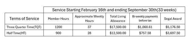 A living allowance of $17,500 will be made every other week (on Fridays) payments of $1060.61. Taxes are deducted and the living allowance is distributed by direct deposit to the member.