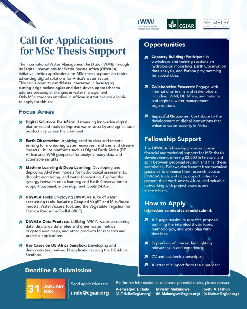 🚀🌍Are you passionate about digital innovation, Earth observation or AI for water management? Through the Digital Innovation for Water Secure Africa (#DIWASA) initiative, the International Water Management Institute (IWMI) is inviting MSc students in institutions in Africa to explore cutting-edge research opportunities to support the continent’s water management and security.💧🎓