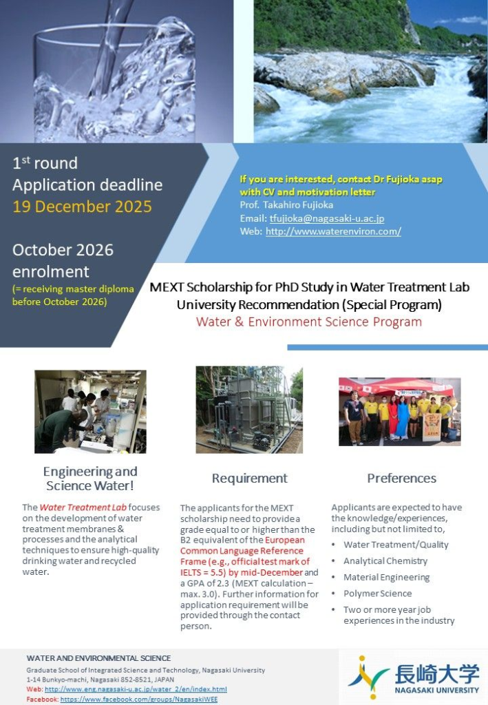 The Water Treatment Laboratory led by Prof. Takahiro Fujioka at the Graduate School of Integrated Science and Technology, Nagasaki University is seeking applicants for PhD program (Water and Environment Science Program) starting in October 2026. We particularly focus on high pressure membrane separation technologies and online water quality analysis technologies in drinking water and water reuse. The scholarship covers all expenditures including travel, enrolment & tuition fees, and living expenses (>$1000 USD/month) for 3 years.