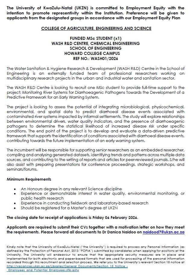 The WASH R&D Centre is looking to recruit one MSc student to provide full-time support to the project: Monitoring River Systems for Diarrhoeagenic Pathogens Towards the Development of a Predictive Framework for an Early Warning System.