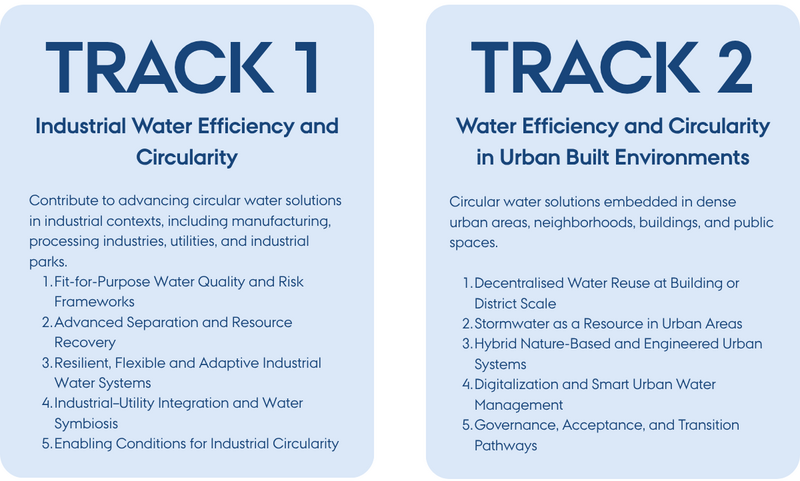 - Must be relevant to track 1 (Industrial Water Efficiency and Circularity) or track 2 (Water Efficiency and Circularity in Urban Built Environments)